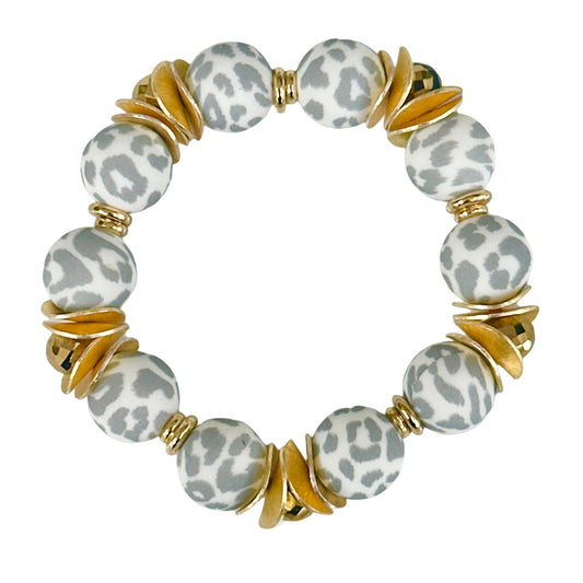 GRAY AND WHITE CHEETAH BANGLE WITH GOLD WAVY DISC AND CRYSTAL ACCENTS