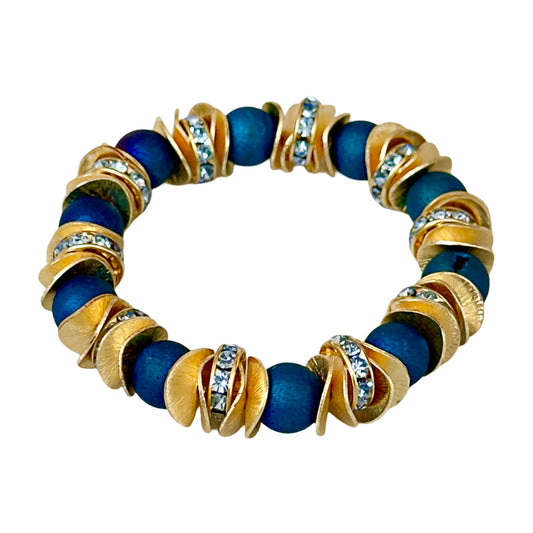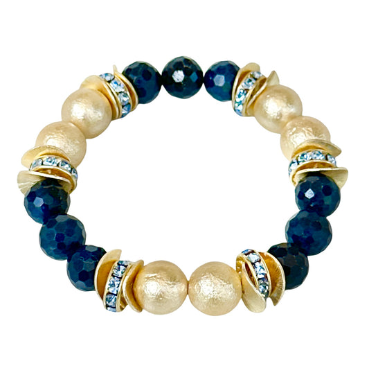 NAVY BLUE FACETED GEMSTONE, GOLD WAVY DISC BANGLE WITH GOLD AND CRYSTAL ACCENTS