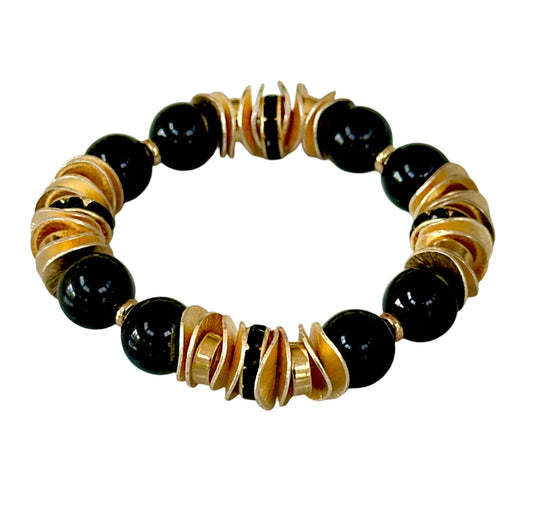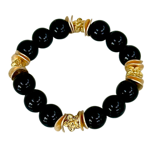 BLACK ONYX GEMSTONE BANGLE WITH GOLD WAVY DISC AND FLOWER ACCENTS