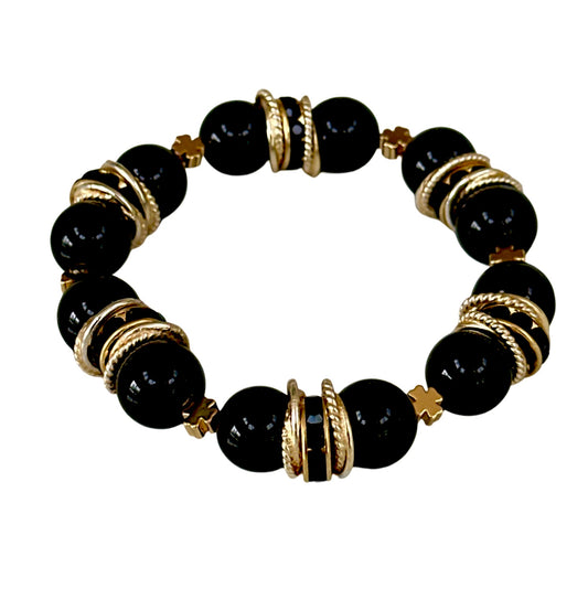 BLACK ONYX GEMSTONE BANGLE WITH GOLD WAVY DISC SND CRYSTAL ACCENTS