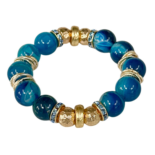 BLUE AGATE GEMSTONE BANGLE WITH GOLD AND CRYSTAL ACCENTS