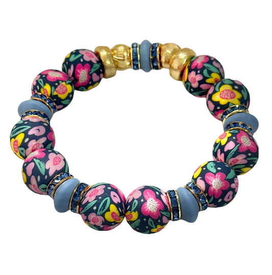 PINK AND NAVY FLORAL BANGLE WITH GOLD AND CZ ACCENTS