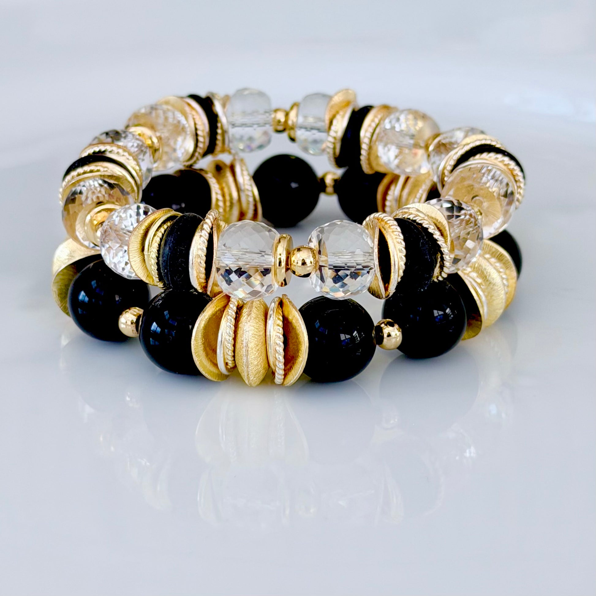 FACETED LUCITE BANGLE WITH GOLD, WAVY DISC AND BLACK ACCENTS