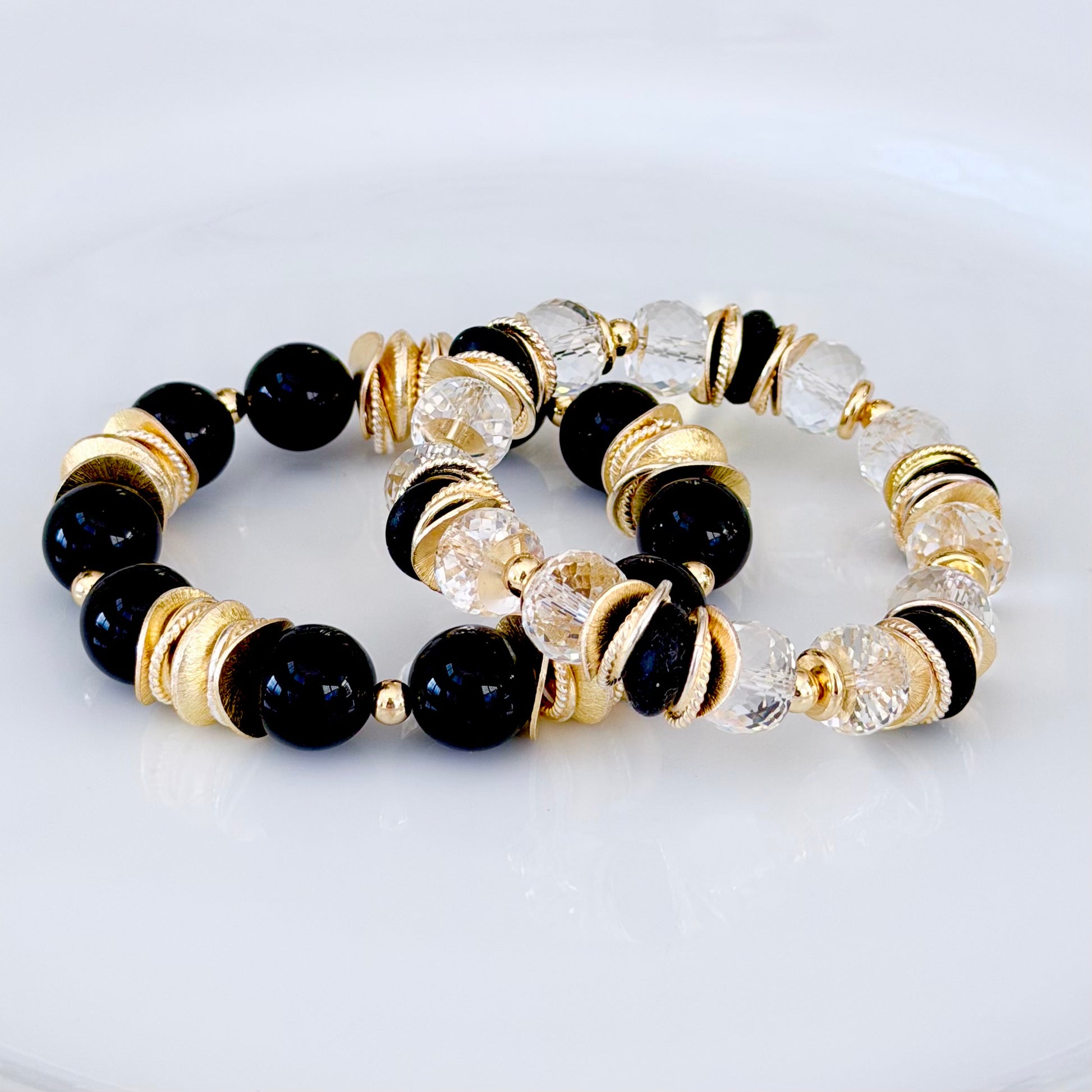 - Gold plated over brass, lucite, and silicone beading.