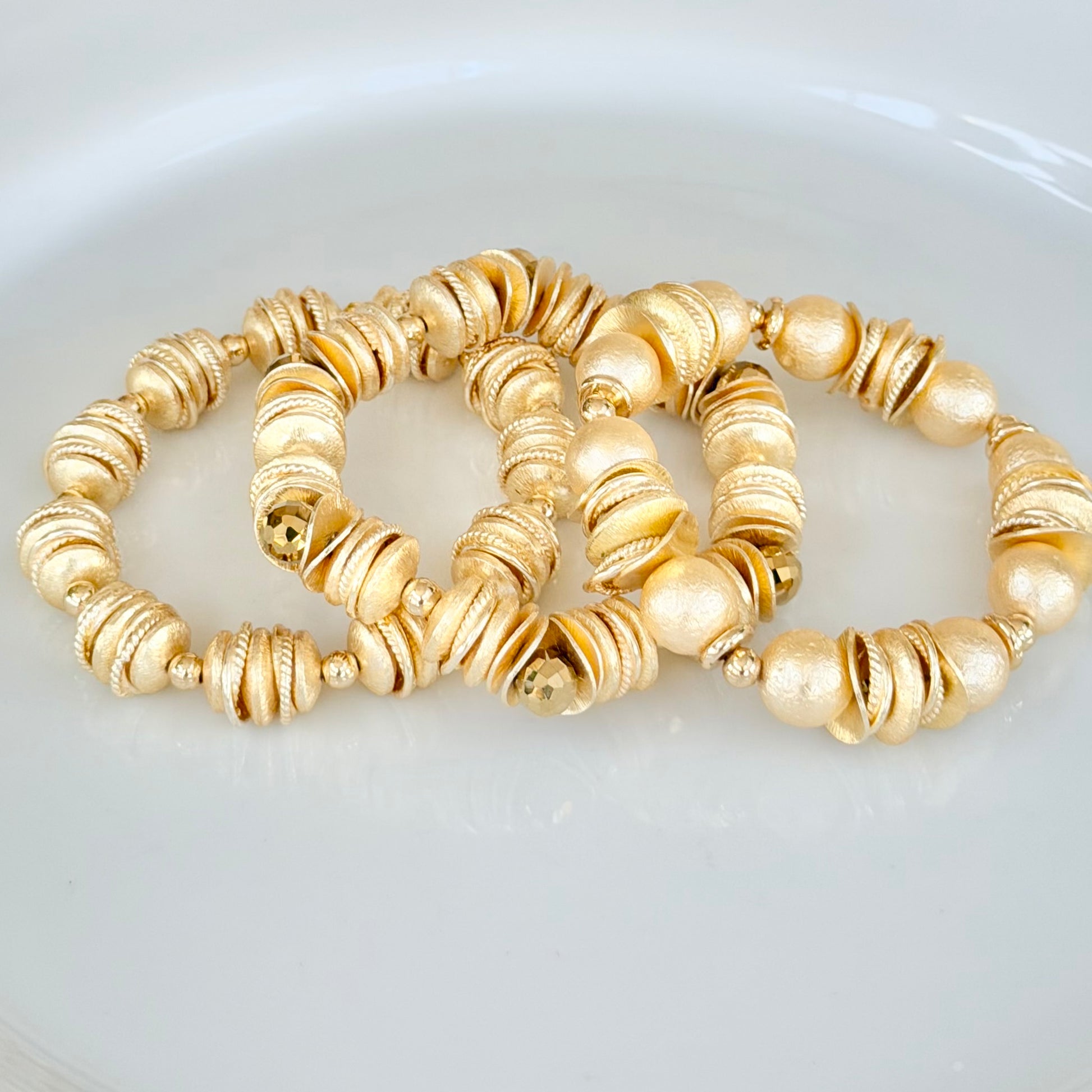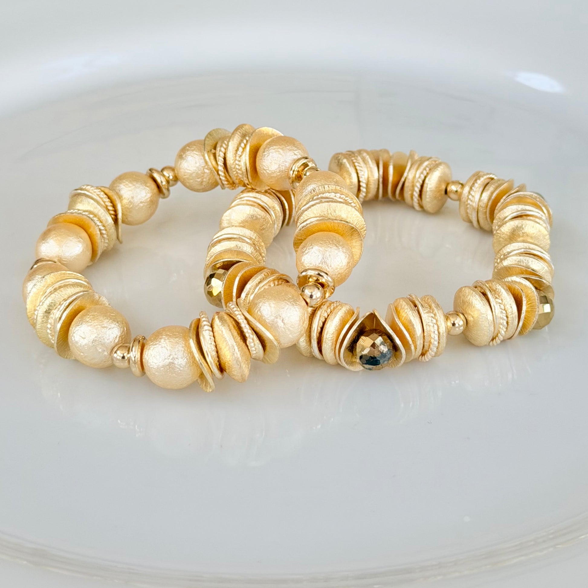 - Shell gold pearl, crystal and gold beading.