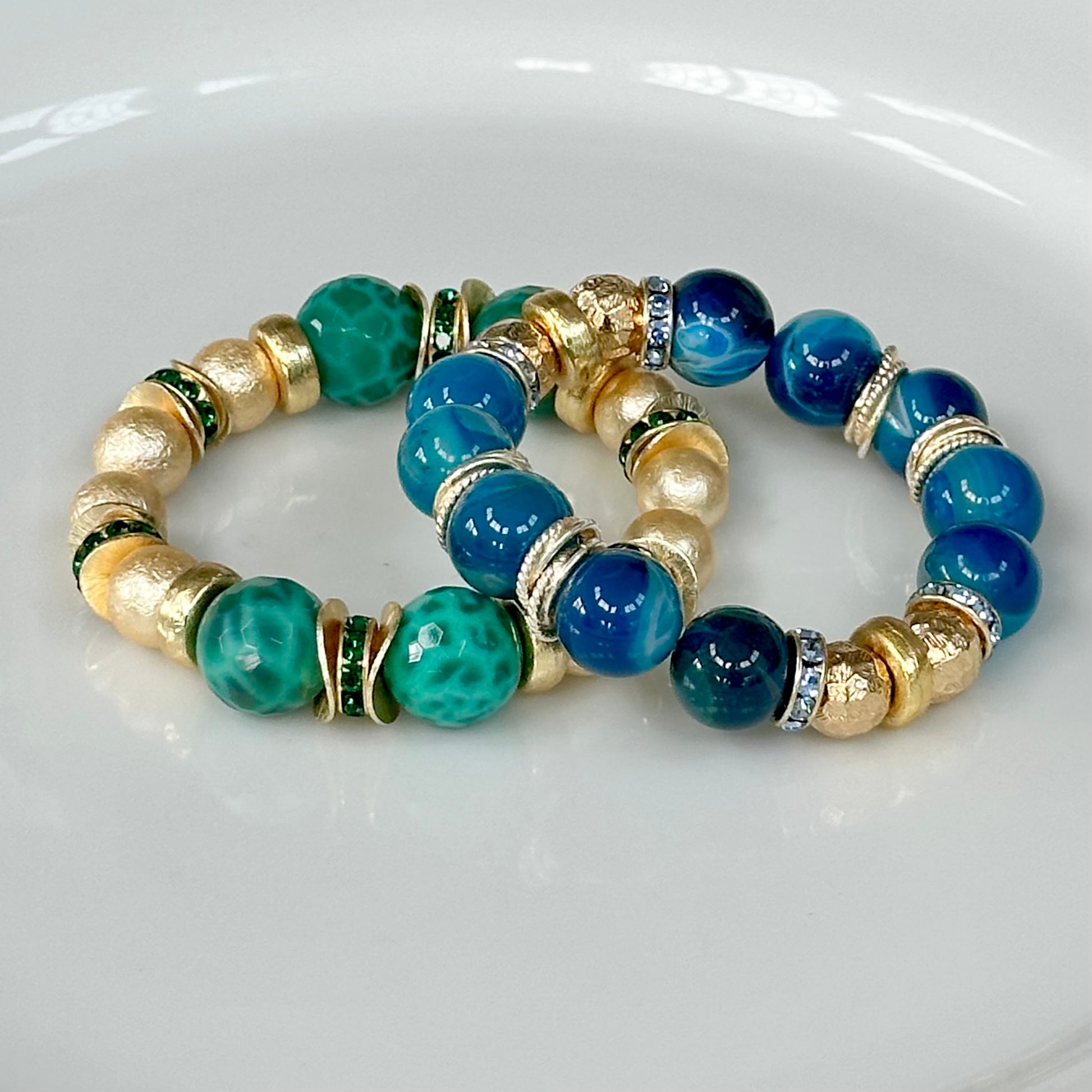 - Agate gemstone, glass gold pearl, crystal and gold beading.