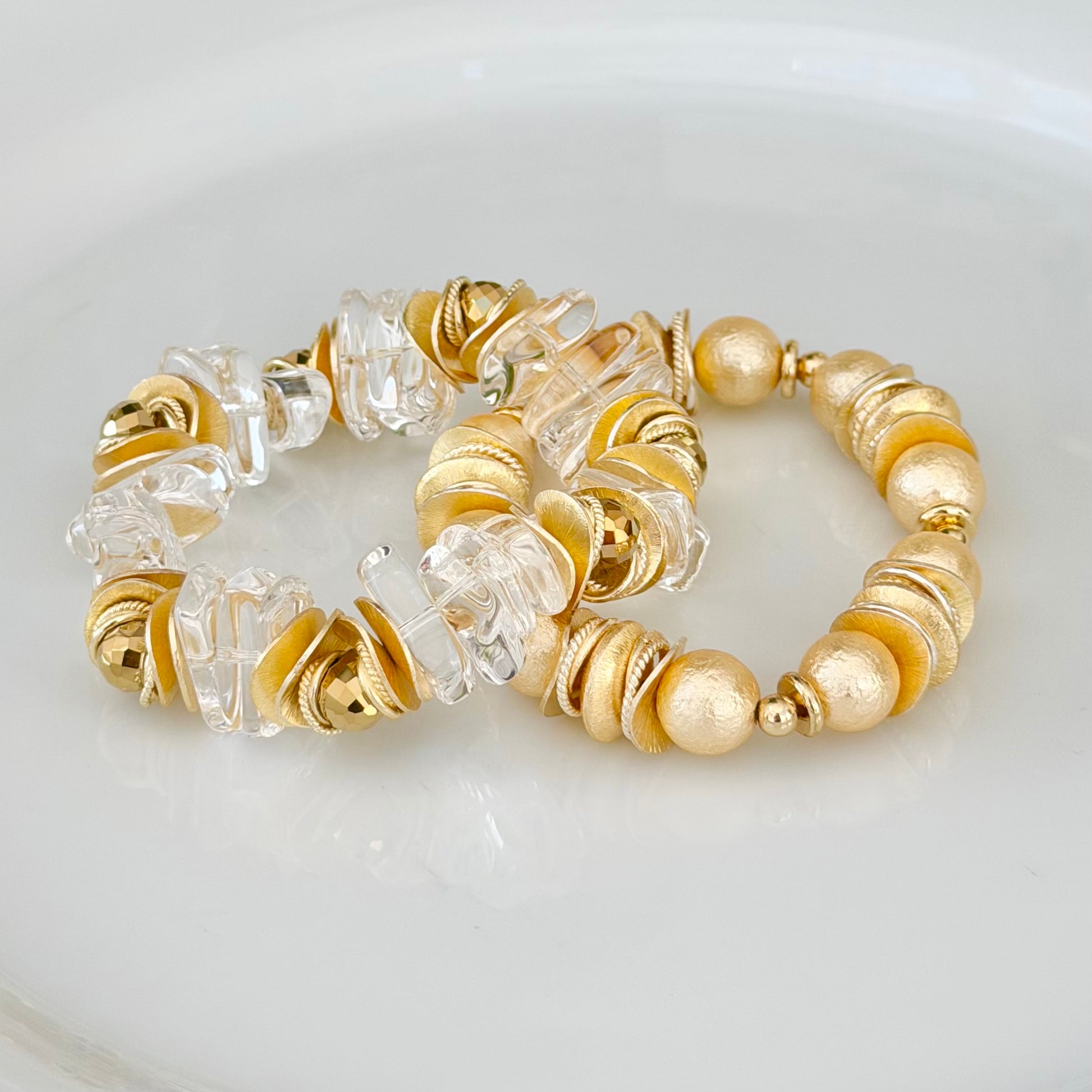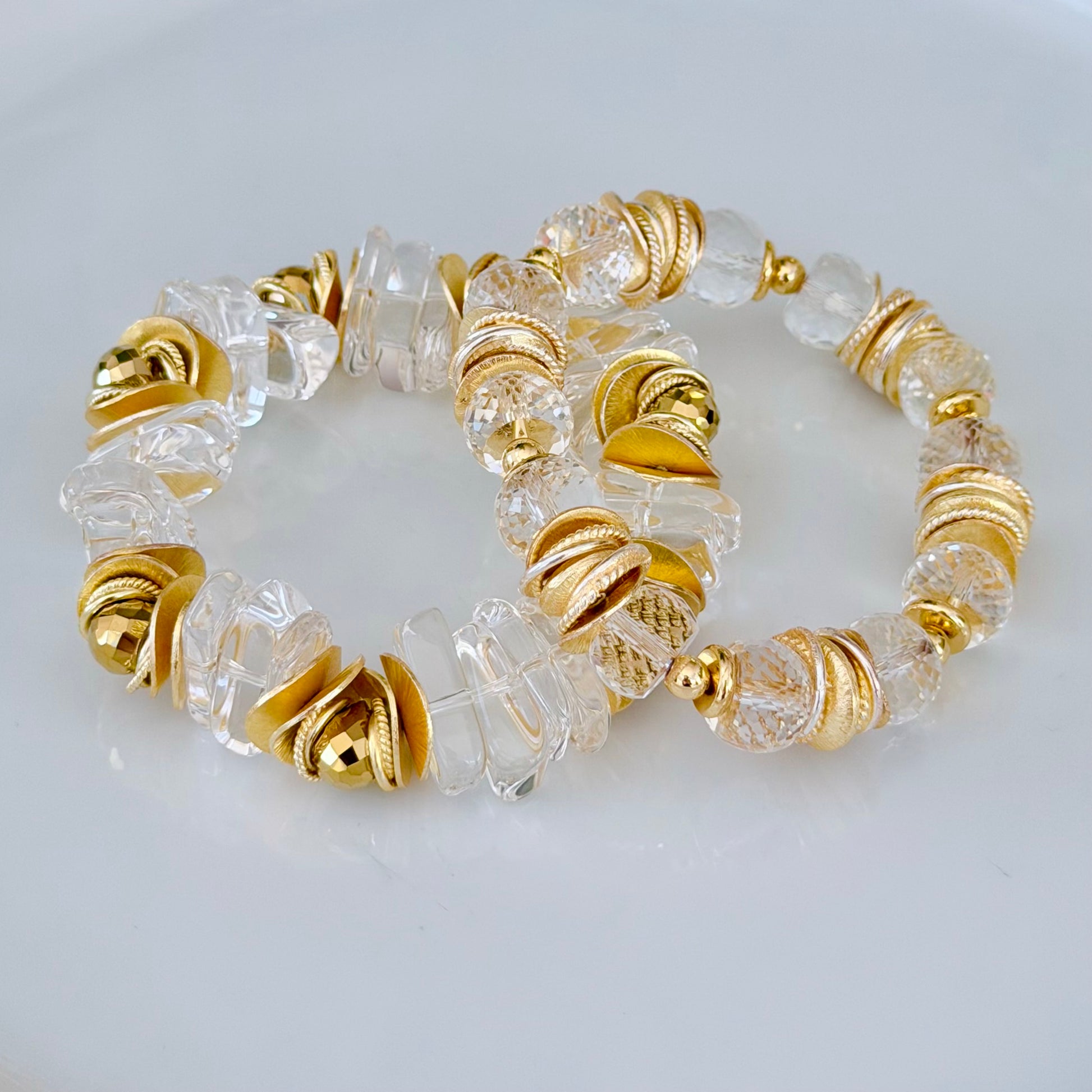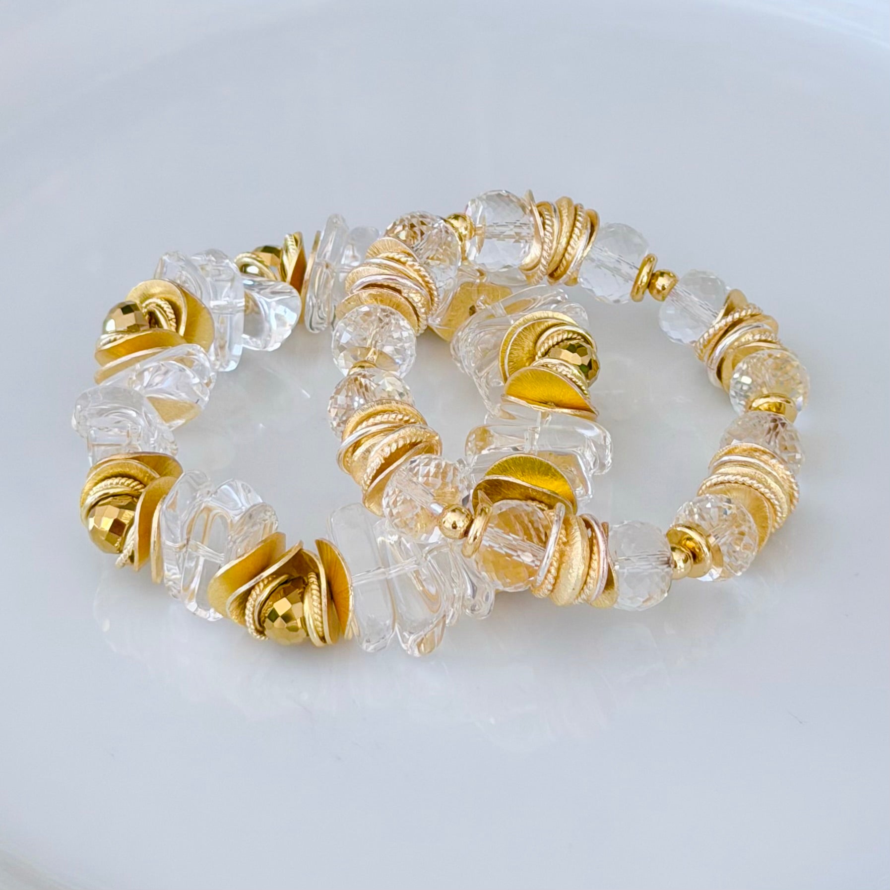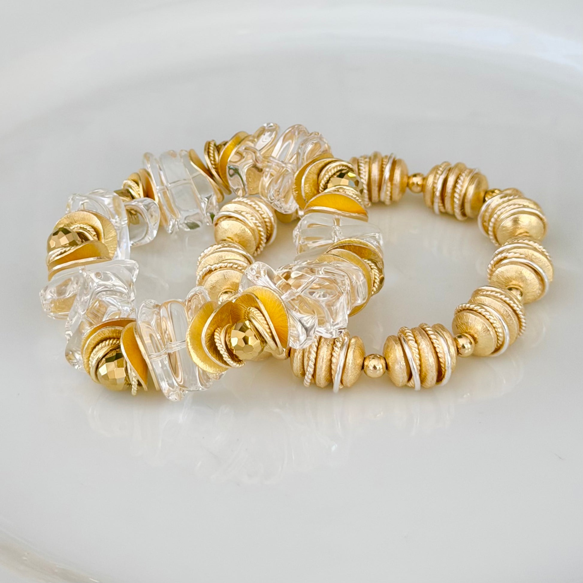 LUCITE BANGLE WITH GOLD TEARDROP AND WAVY DISC ACCENTS