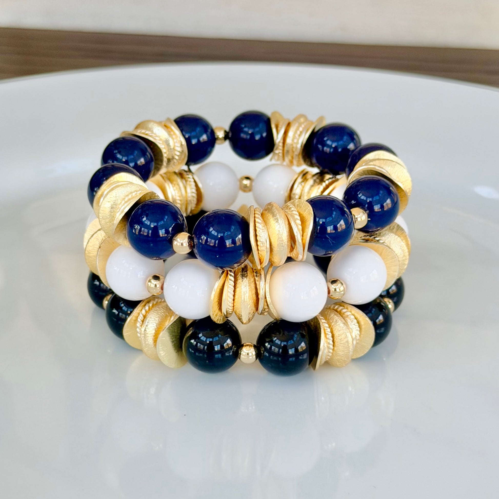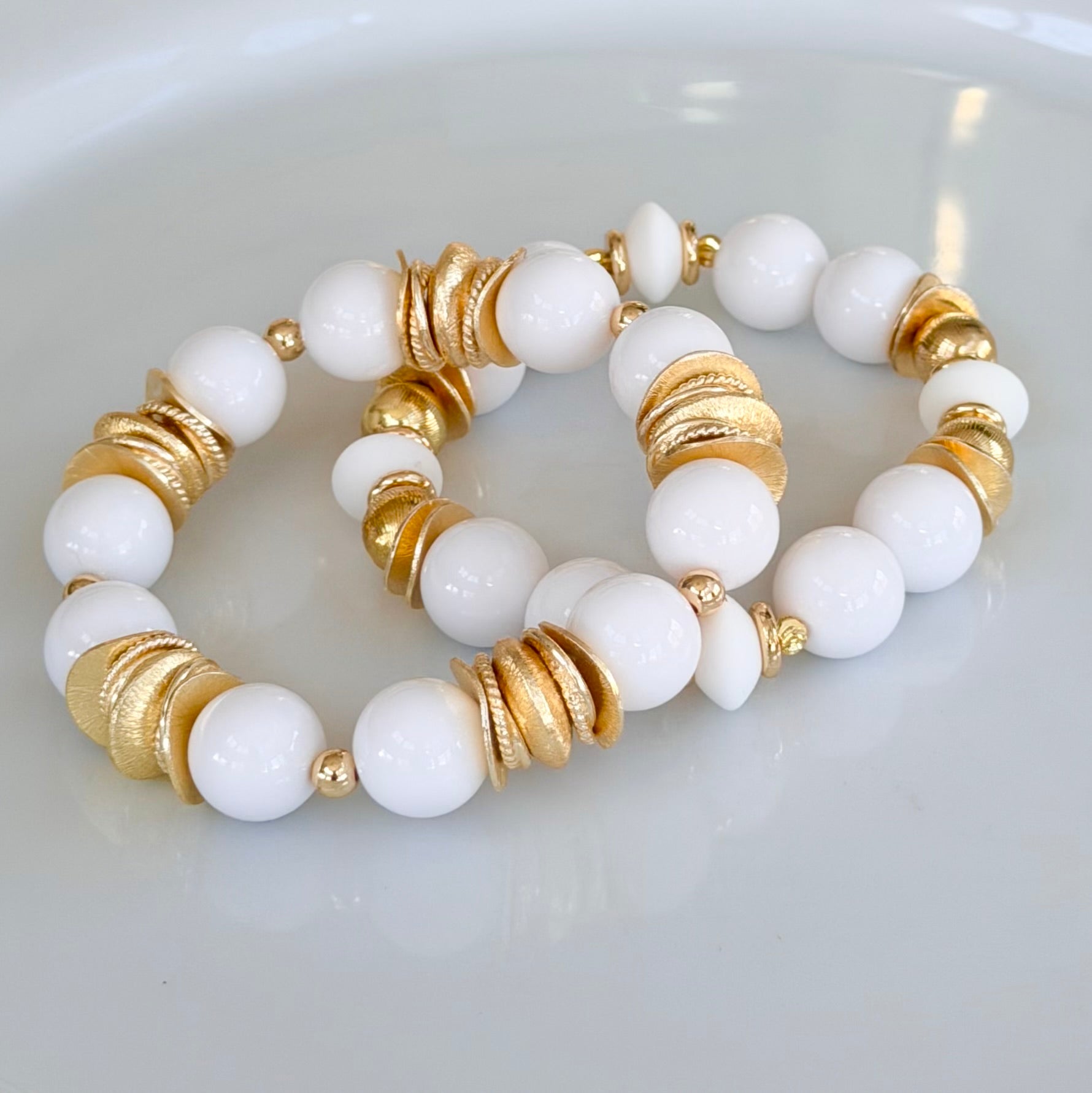 WHITE AND GOLD WAVY DISC BANGLE WITH BRUSHED GOLD ACCENTS
