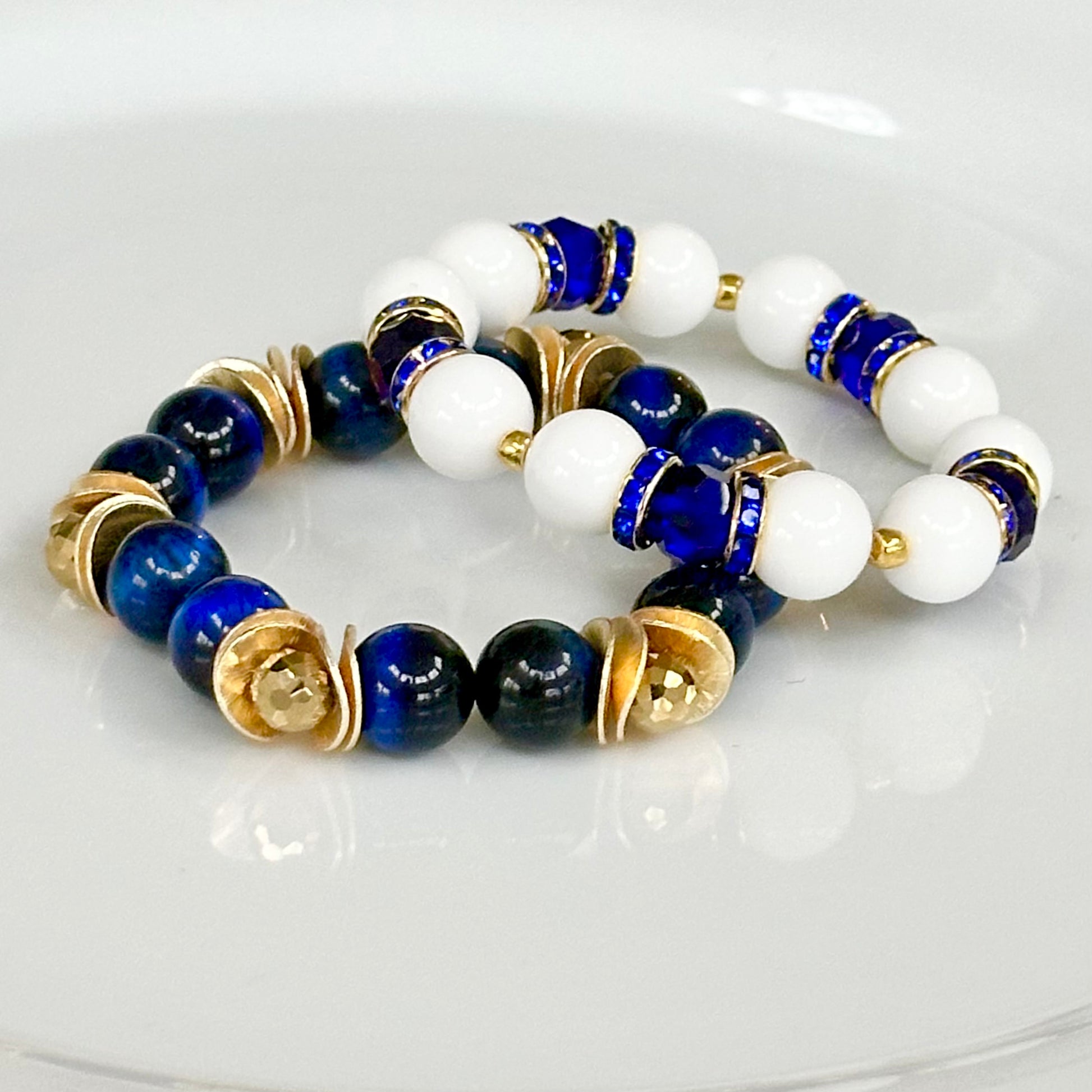 WHITE PORCELAIN AGATE GEMSTONE BANGLE WITH COBALT CRYSTAL ACCENTS